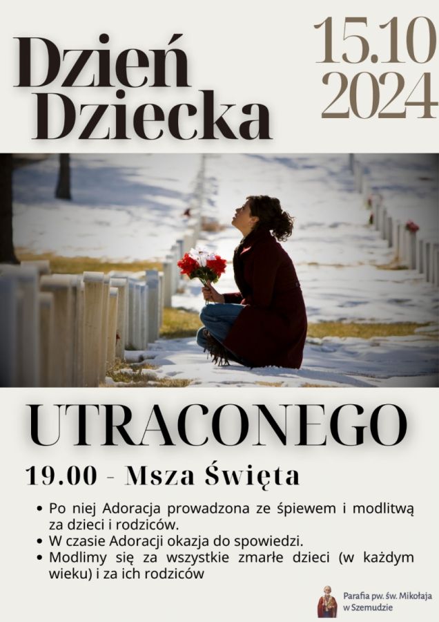 - W najbliższy wtorek 15 października będziemy przeżywali Dzień Dziecka Utraconego. To dzień, w którym chcemy objąć szczególną modlitwą rodziców, przeżywających odejście swojego dziecka. Każdego dziecka. Dziecka, które odeszło na skutek choroby, poronienia, własnej decyzji czy z powodu wieku. Serdecznie zapraszamy więc na Mszę św. o godz. 19.00 w naszym kościele w intencji rodziców i ich utraconych dzieci. Po Mszy św. będziemy modlić się w czasie adoracji, przy oprawie muzycznej zespołu „Alis Fidei”. Będzie też okazja do spowiedzi św. (Przed Mszą św. przy wejściu do kościoła będzie wystawiony koszyk, do którego będzie można włożyć kartkę z imieniem dziecka. Imiona dzieci będą odczytane w czasie Eucharystii).