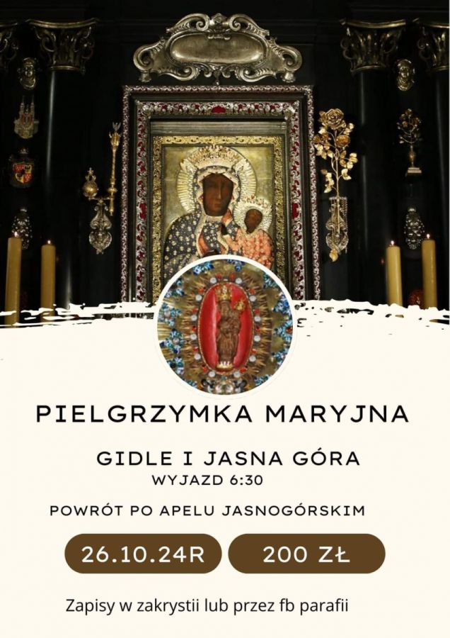W sobotę 26 października nasza parafia organizuje 1-dniową pielgrzymkę autokarową do sanktuariów Maryjnych w Gidlach i na Jasną Górę. Serdecznie zapraszamy!