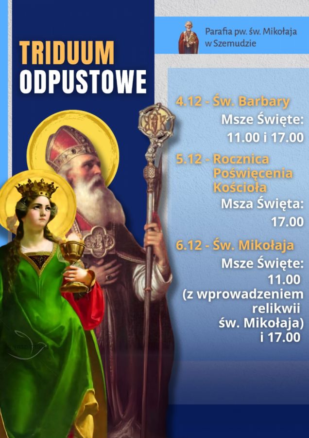 - W piątek przypada odpust ku czci św. Mikołaja. Msze św. będą o godz. 7.00, 11.00 (suma odpustowa, wprowadzenie relikwii naszego świętego Patrona i procesja wokół kościoła) oraz o godz. 17.00 (Msza odpustowa).