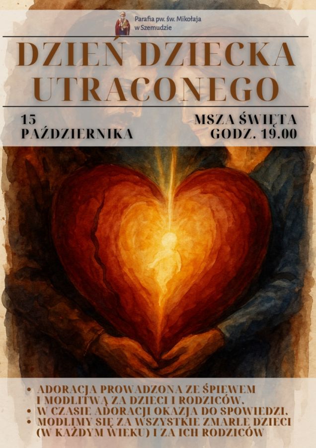 Serdecznie zapraszam na Mszę św. o godz. 19.00 i adorację Najświętszego Sakramentu prowadzoną przez zespół muzyczny. Zachęcam, aby przynieść zapisane na kartkach imiona swych dzieci i złożyć je do koszyka przed Mszą św. W czasie modlitwy powierzymy je Bogu, który jest Miłością i Życiem. Niech to będzie czas pamięci, nadziei i uzdrowienia serca...